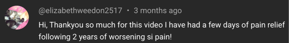 Hi, Thank you so much for this video I have had a few days fo pain relief following 2 years of worsening si pain!
