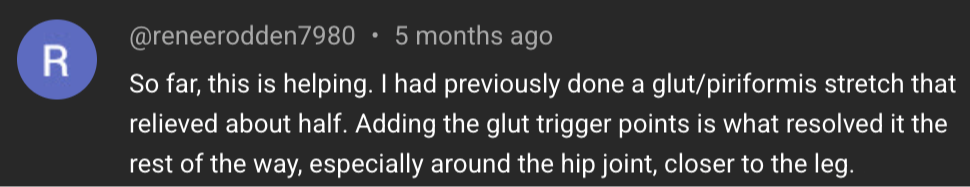 So far, this is helping. I had previously done a glut/piriformis stretch that relieved about half. Adding the glut trigger points is what resolved it the rest of the way, especially around the hip joint, closer to the leg.